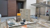 化粧ブロック門柱に空洞ブロックをスリットに入れた