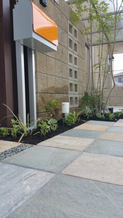 HOMEビフォーアフター新築外構 > 木目調の角柱とオレンジポストの新築外構 姫路市