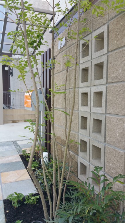 門柱の前のシンボルツリーが爽やかな印象
