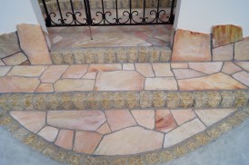 清潔感ある白塗りの門柱にピンクオレンジ色系の
