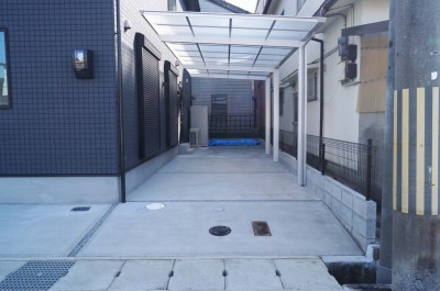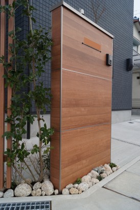 道路のコーナー部分には門柱同様ウッド調の目隠しスクリーン