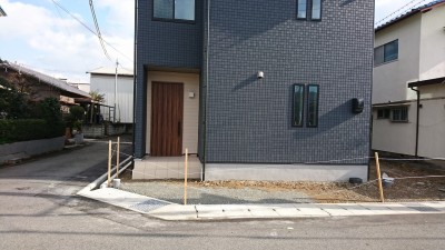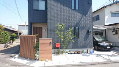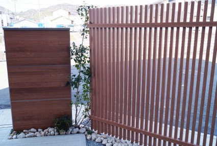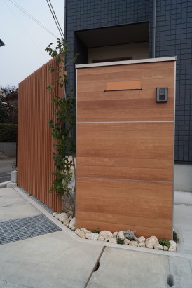 HOMEビフォーアフター新築外構 > 耐候性に優れているウッド調ボードでオリジナル門柱と目隠しウッド調フェンス 姫路市