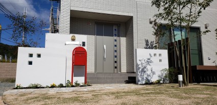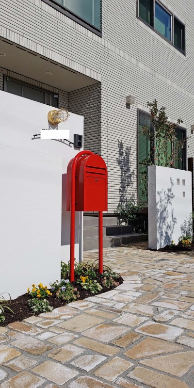 遠くからでも真っ白な塗り壁門柱と赤色ポストが一際目立つ