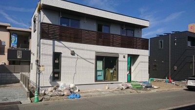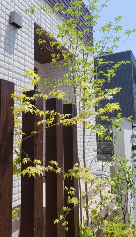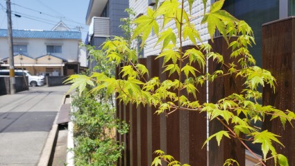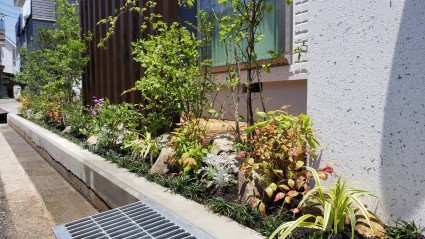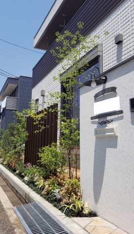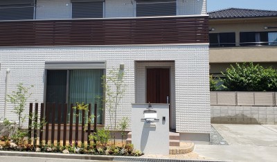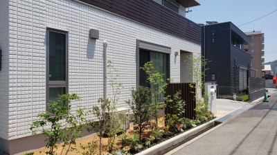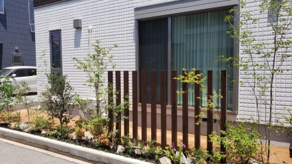 姫路市新築外構|木目調アルミ角柱のスリットフェンスと緑豊かな植栽で道路からの目隠し