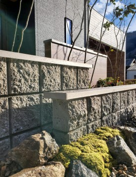 サブ門柱の足元は低木やグランドカバーに自然石。
