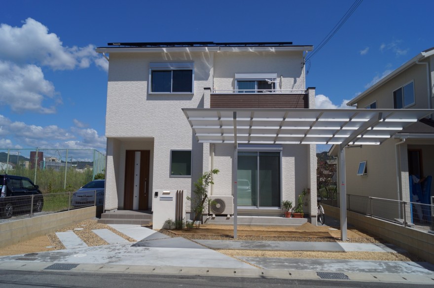 すっきりとした印象の門柱に駐車スペースを2台確保したオープン外構