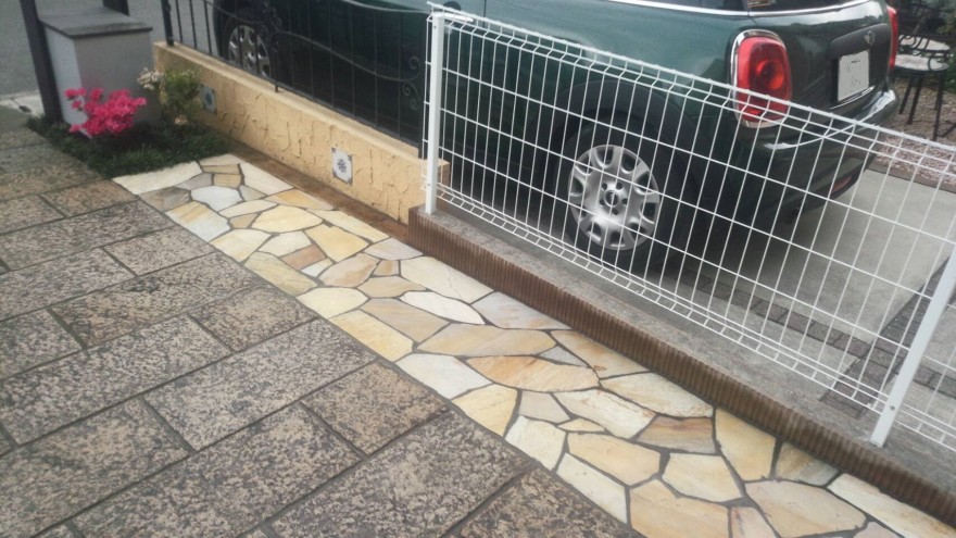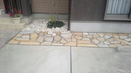 イエロー系の自然石の乱貼りで明るい印象のアプローチになりました。