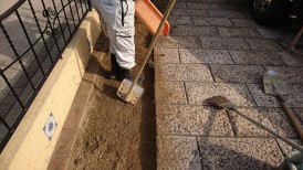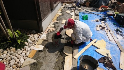 石と石のすき間の目地にセメントを入れていきます。