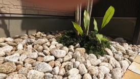 玄関脇の植栽スペースはゴロタ石と