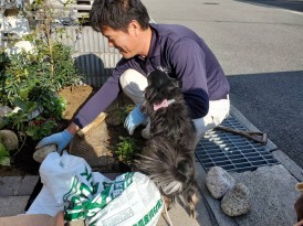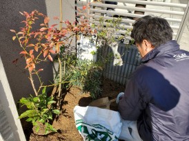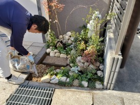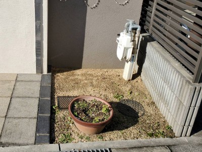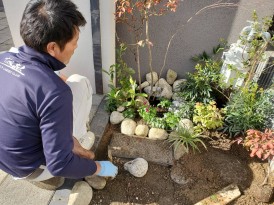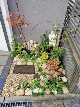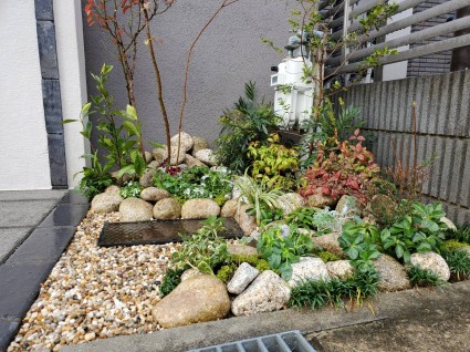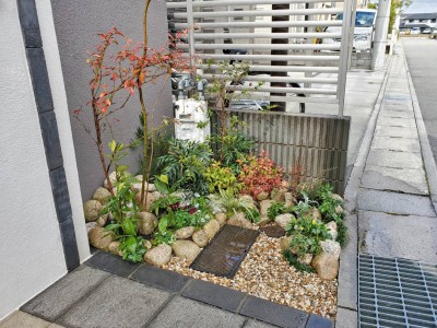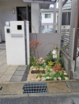 HOMEビフォーアフターガーデン > 姫路市植栽工事|門柱前の小さな花壇を植木と下草と自然石で素敵にアレンジガーデン