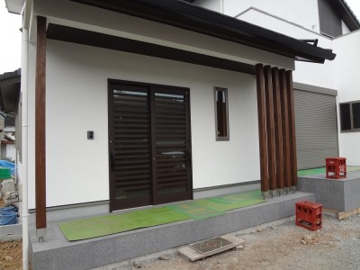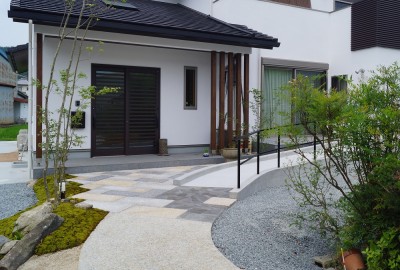 玄関の石畳,再利用してもらった石臼,植栽(足元の苔)ライトアップされた姿がとてもお気に入りです。