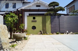 抹茶色のモダンな塗り壁門柱に和テイストの
