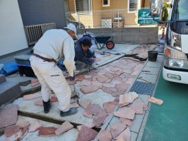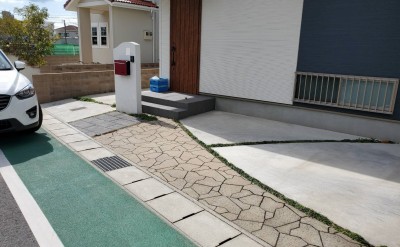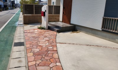 セメント系の舗装材が暗い印象だった外構を自然石の乱形貼りで明るい可愛い外構にリフォーム