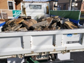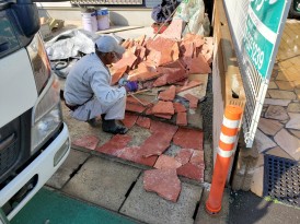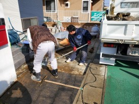 アプローチと車庫の二色使いしてあったセメント系の石を撤去。