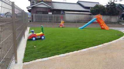 人工芝とマサ土舗装で雑草が生えにくいお庭