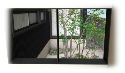 姫路オシャレ住宅の坪庭|浴室・玄関ホールから見る坪庭