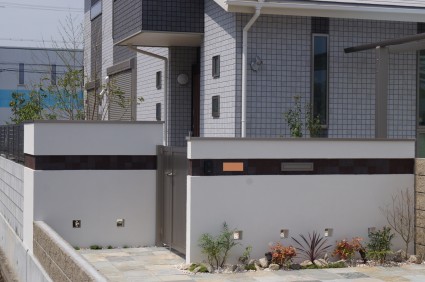 姫路外構工事|白塗り壁にグレーがアクセントラインの門柱