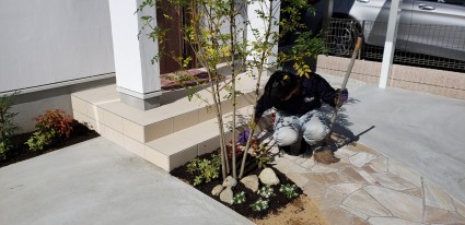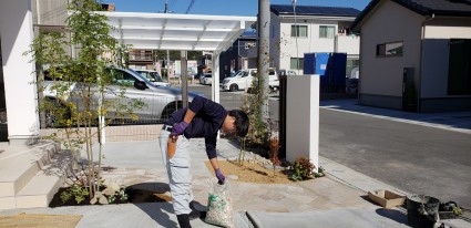 モダンな門廻りに植栽のグリーンが良く映えています。