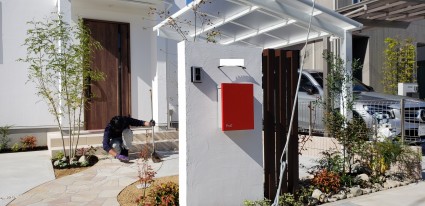 太子町外構|塗り壁門柱とアイアン表札・赤色ポストのモダンエクステリア