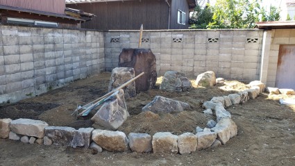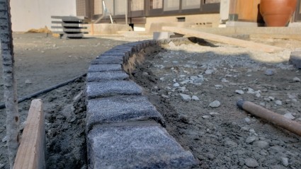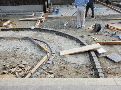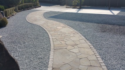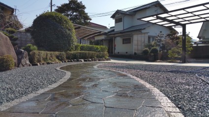ピンコロ石で縁取りした自然石貼り和風のアプローチ工事