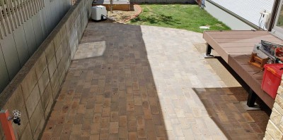 ウッドデッキの前をレンガ敷の