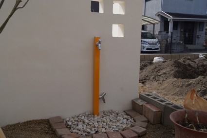 門柱の後ろに可愛い立水栓