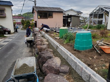 化粧ブロック(ミカゲ)を1段積んでいきます。