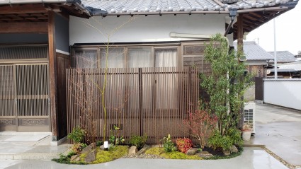 和風住宅のリビング窓の目隠しフェンスと和モダン植栽