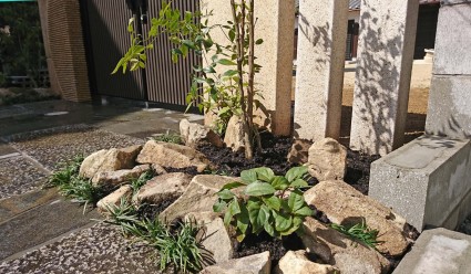 門柱の足元をゴロタ石と植栽を組み合わせて