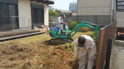 雑草と芝生の根っこを重機を