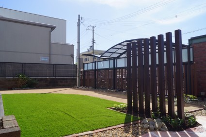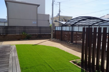 人工芝の緑が美しい庭に大改造です。