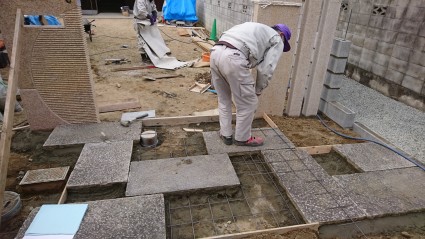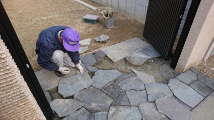 板石の古くなっている感じが鉄平石とすぐに馴染んで