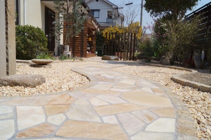 インド砂岩の板石をアプローチ入口部に敷き詰め