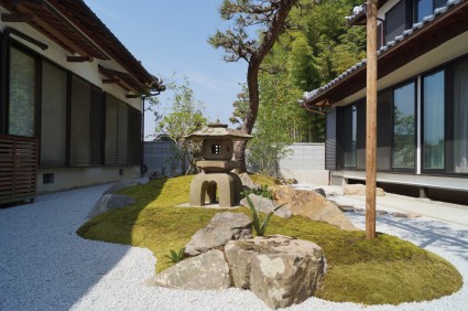 築山を設けて景石と石灯篭で趣ある庭にしました。