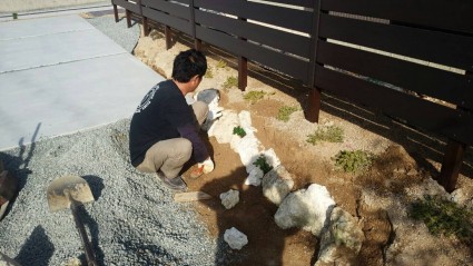 石と植栽で自然な雰囲気に土留めを設置しました。