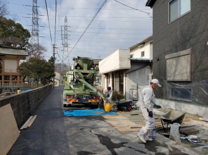 生コン車でコンクリートを打設します