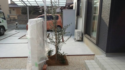 シルバー系の葉っぱのオリーブが可愛い門廻りになりました。