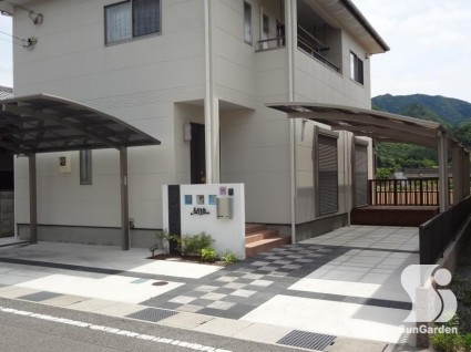 駐車場部分までスクエアストーン アートブラックでラインを伸ばし、つながりを持たせています。