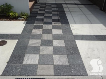 アプローチにはスクエアストーンのアートブラックとダイアモンドピンクを市松張りにしています。