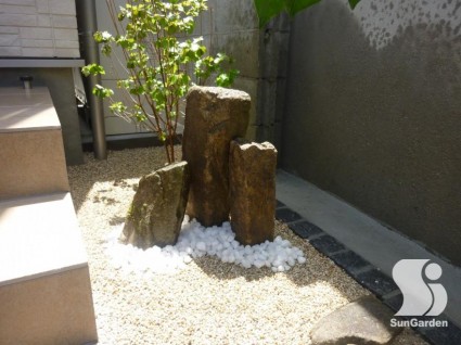 玄関横には自然石の生野六方石でアレンジして三本の石を立ててポイントをつくりました。