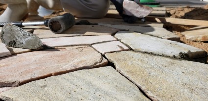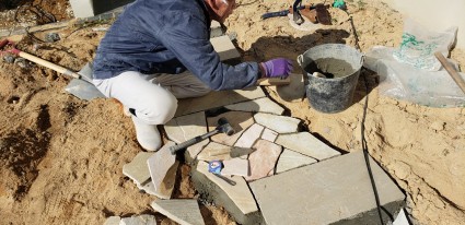 砂岩石を一枚一枚貼りあわせていく自然石貼り
