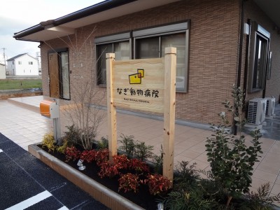 動物病院様の外構工事が完成しました。木製看板の可愛い動物病院は