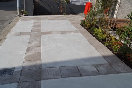 建物の白黒のモダンな建物に合わせて、外構はダークグレイ色で統一しました。