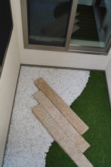 坪庭は、御影のべ石を並べて白玉砂利と人工苔で