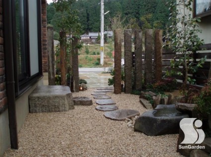 全体に伊勢砂利を敷き詰め、飛び石を据えて玄関の方へ導きます。