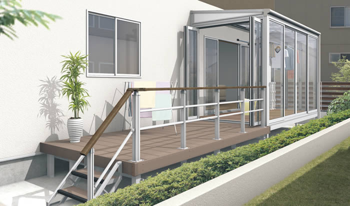 商品色:アーバングレー タイプ:600タイプ/アール屋根/デッキ連結仕様/ステップ/1階用フェンス