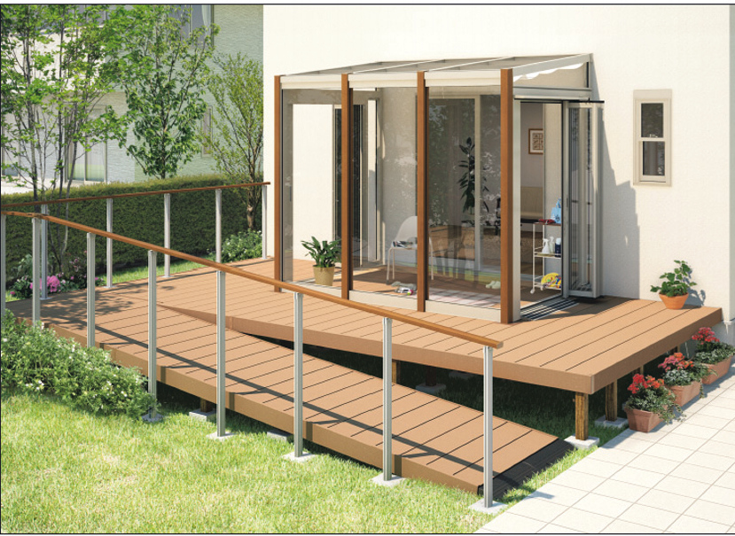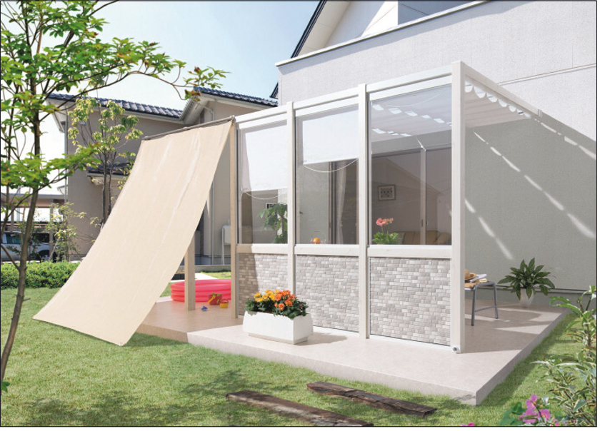 【サイドクローズタイプ…正面はFIX窓,両側面はルーバー引戸の全天候型ガーデンテラス】