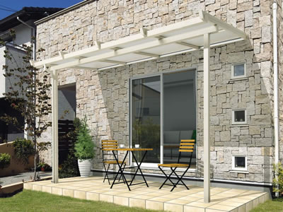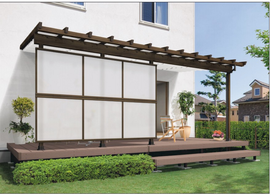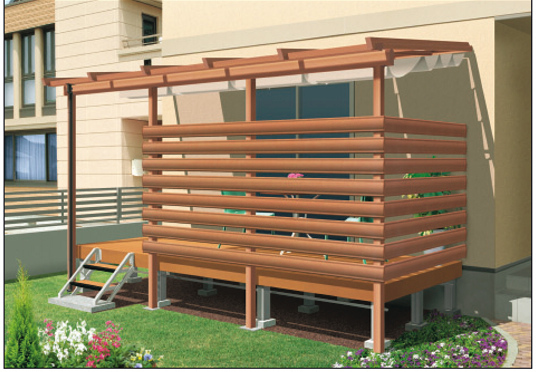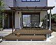 <ナチュラルな風合いを演出する木目調テラス。木の素朴さと温もりを感じるデザインと多様な機能で、新たな住宅外観を演出します。>