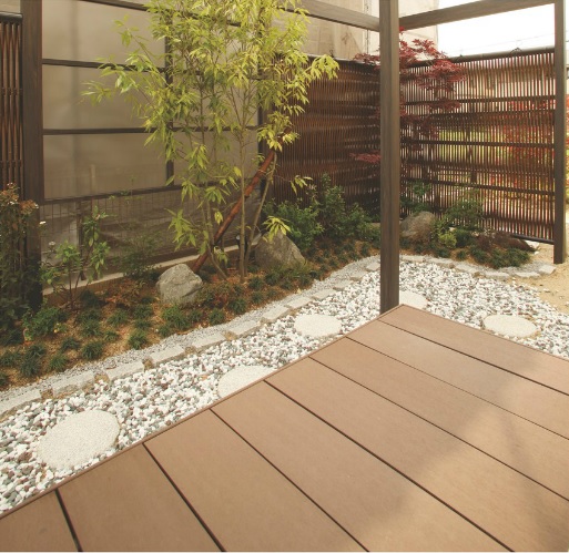 廃木材の木粉と廃プラスチックを配合し、腐食、ささくれ、シロアリといった木材の弱みを解消。