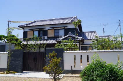 黒と白そしてグリーンのバランスがとても美しく、入母屋の建物と調和のとれた、堂々とした門構えが完成しました。